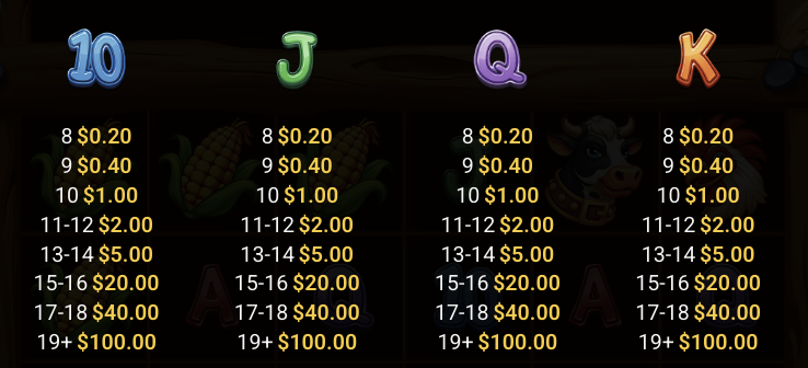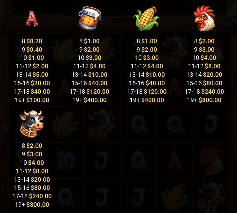 『ファーマゲドン(Farmageddon)』は6リール5列、同じシンボルが8個以上出現すると配当成立となるドロップ方式のスロットゲームです。