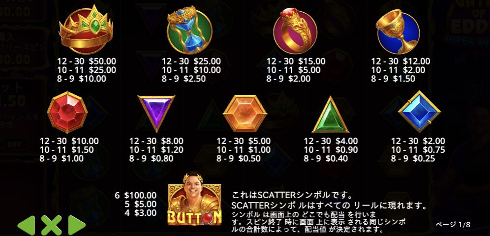『ゲーツオブエディースーパーボタン(Gates of Eddie Super Button)』は同じシンボルが8個以上出現すると配当成立となるドロップ方式のスロットゲームです。