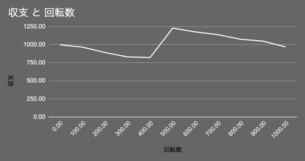 実際に『レジェンドオブオーディン(Legend of Odin)』を1000ゲーム回した結果が以下の通りです!