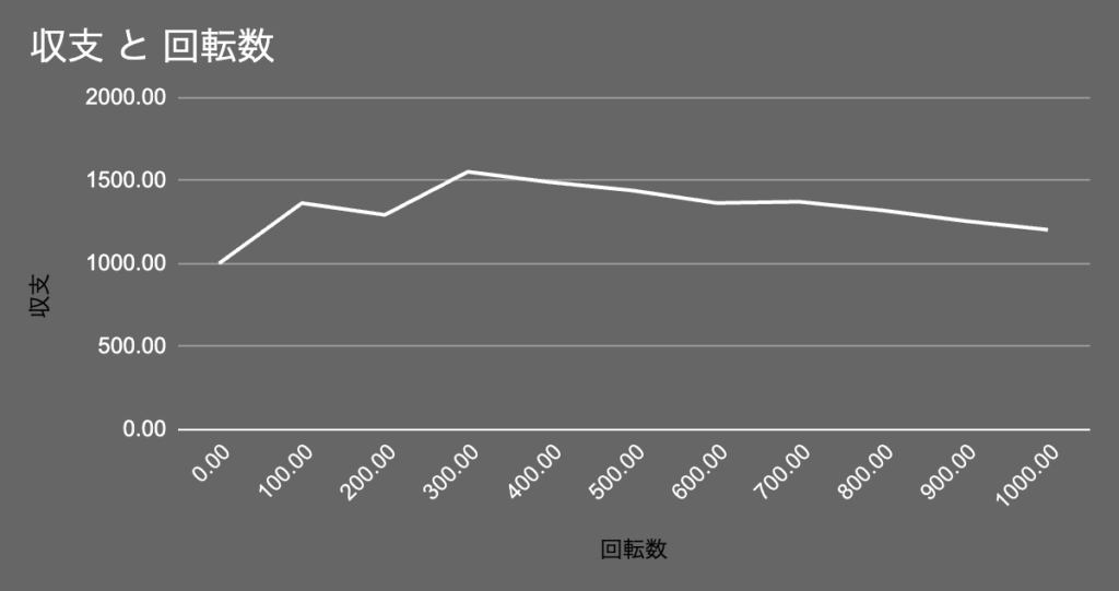 実際に『ヴァルカンラース(Vulcans Wrath)』を1000ゲーム回した結果が以下の通りです!