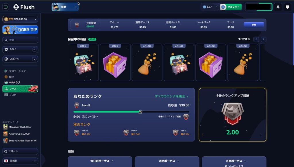 フラッシュカジノ(Flush Casino)のVIPプログラムは登録すると自動的に参加となります!また、ベットするとポイントが貯まり、ランクに応じてさまざまな特典をもらうことが可能!