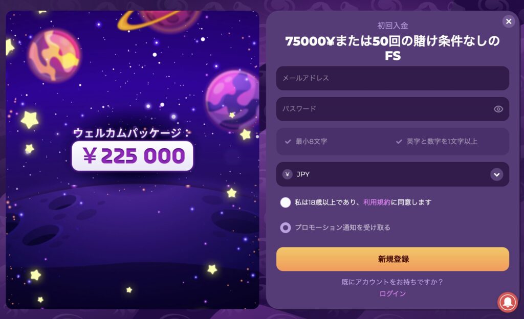 また、登録後1時間のみ初回ボーナスの割合が増加するので、プロモーションを利用する場合は入金準備が整ってから登録しましょう!