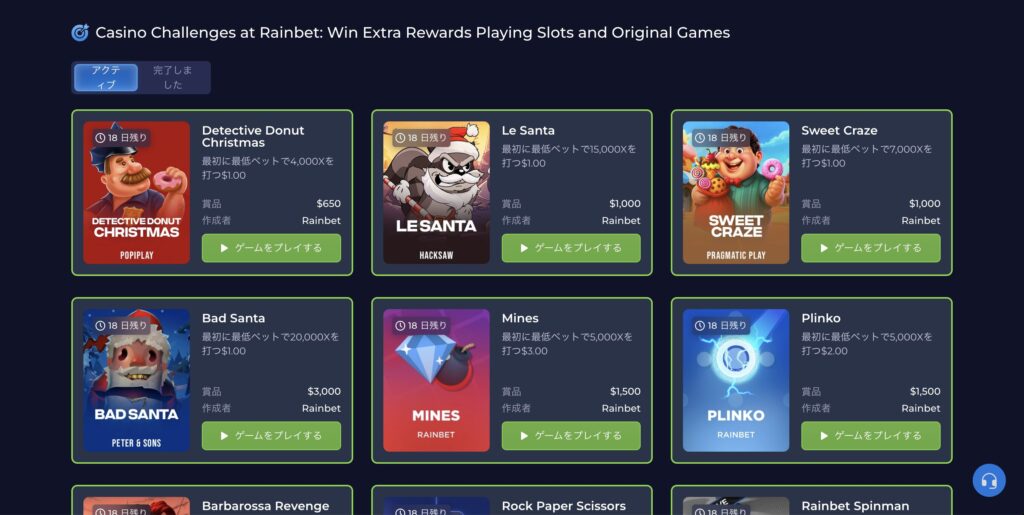 レインベット(Rainbet)ではスロットゲームやRainbetオリジナルゲームで特定の目標を達成すると、追加報酬を獲得できます!